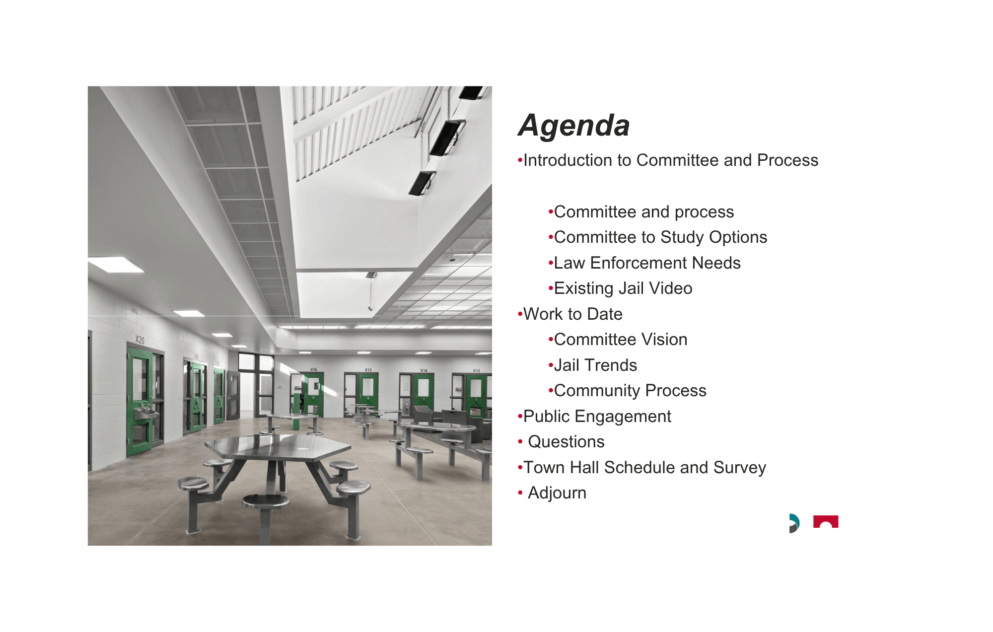 An overview is provided of the committee and its process, beginning with how the group was formed and its overall purpose. It explains the role of the Committee to Study Options, outlines law enforcement needs, and includes a look at the existing jail through video materials. The content highlights work completed to date and shares the committee’s vision moving forward, while also examining current jail trends that may influence future decisions. Emphasis is placed on the community process and public engagement, encouraging residents to ask questions and stay involved. Information about upcoming town hall meetings and a community survey is also included, concluding with final remarks and adjournment.