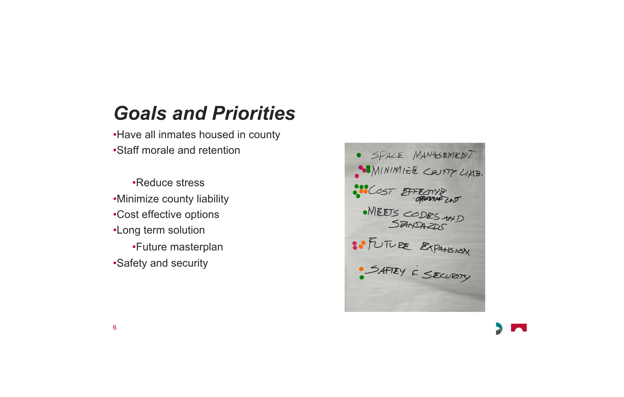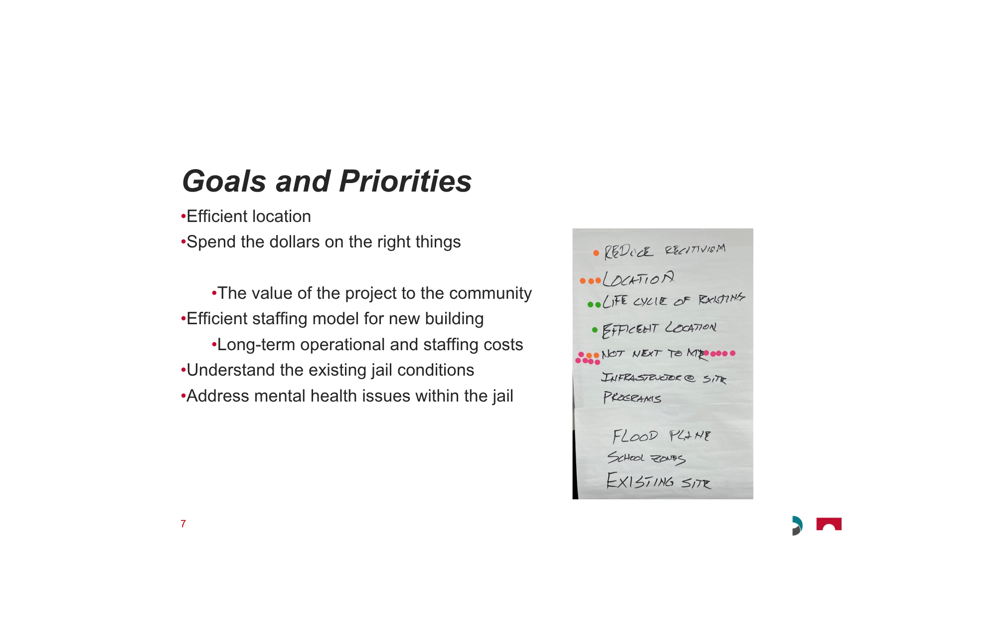 Community input consistently emphasizes the need for a facility that is safe, secure, cost‑efficient, and appropriately sized, with flexibility to serve the County for the next 50–100 years.